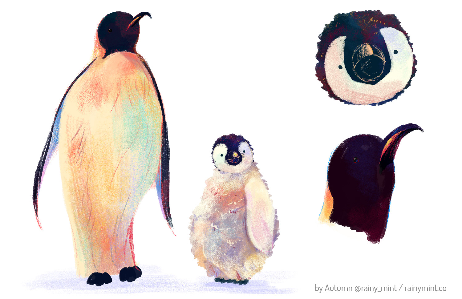 Miss Chinchilla, a cozy grandmother of two, stylized studies and explorations of emperor penguins, and some little space friends.