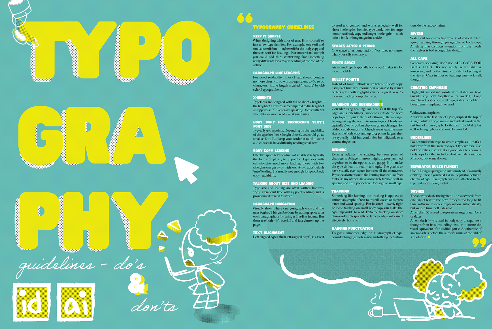 An extra large format limited color palette poster providing tips on typography. Illustrated in Adobe Illustrator, and designed in Adobe Illustrator and InDesign.